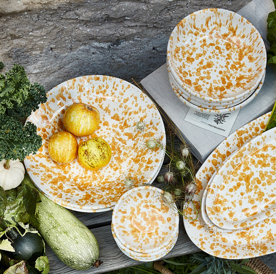 Den stänkmålade keramiken "Spruzzi" tillverkas i Apulien i södra Italien av familjen Benegiamo. En solklar favorit både bland oss och våra kunder.