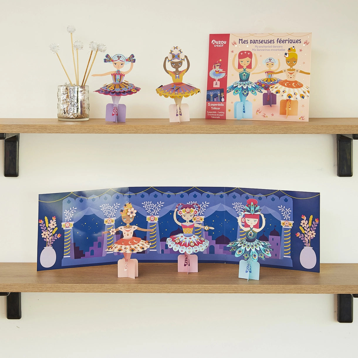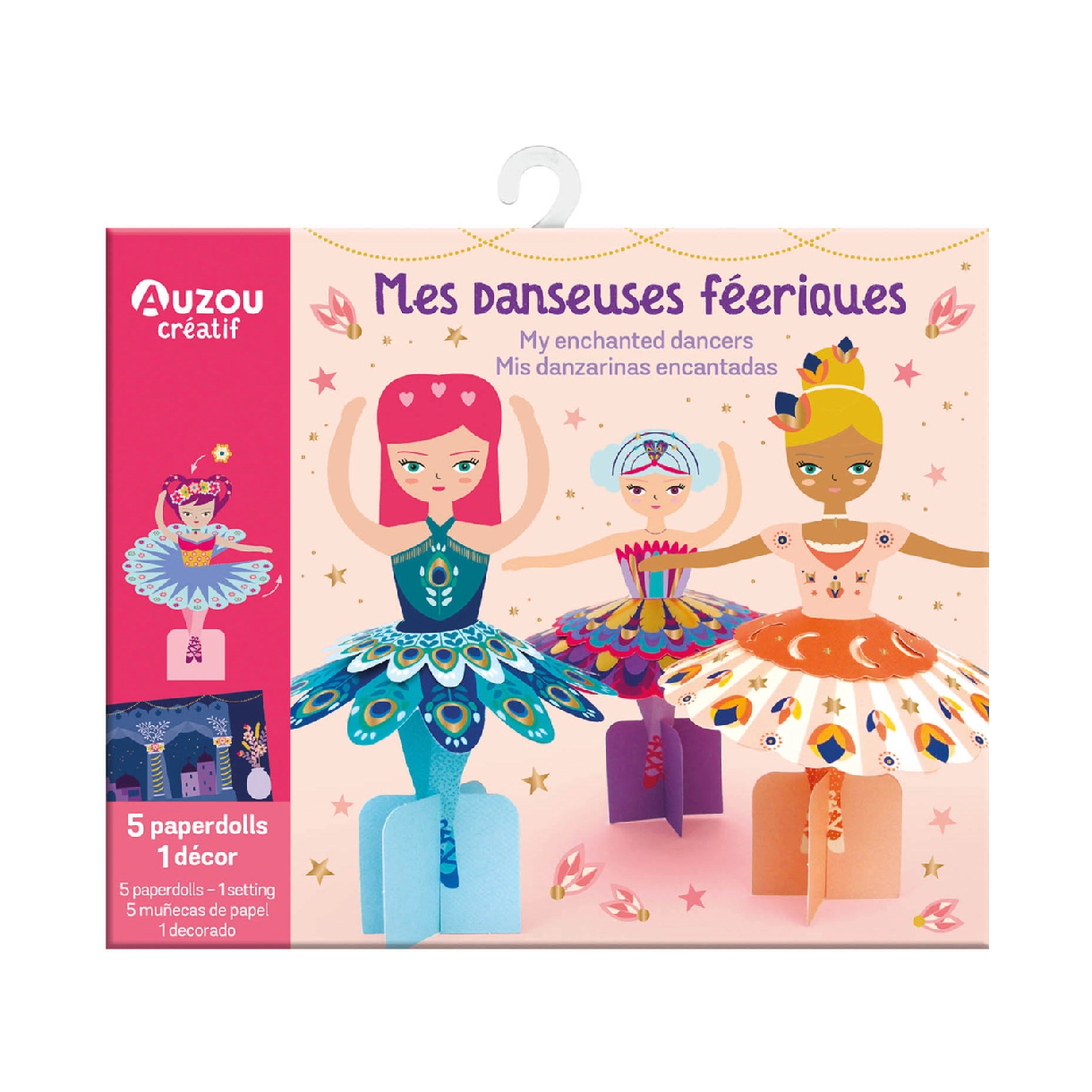 Skapa 5 vackra ballerinor av dessa konstnärliga pappersark genom att fästa de medföljande dekorationerna.