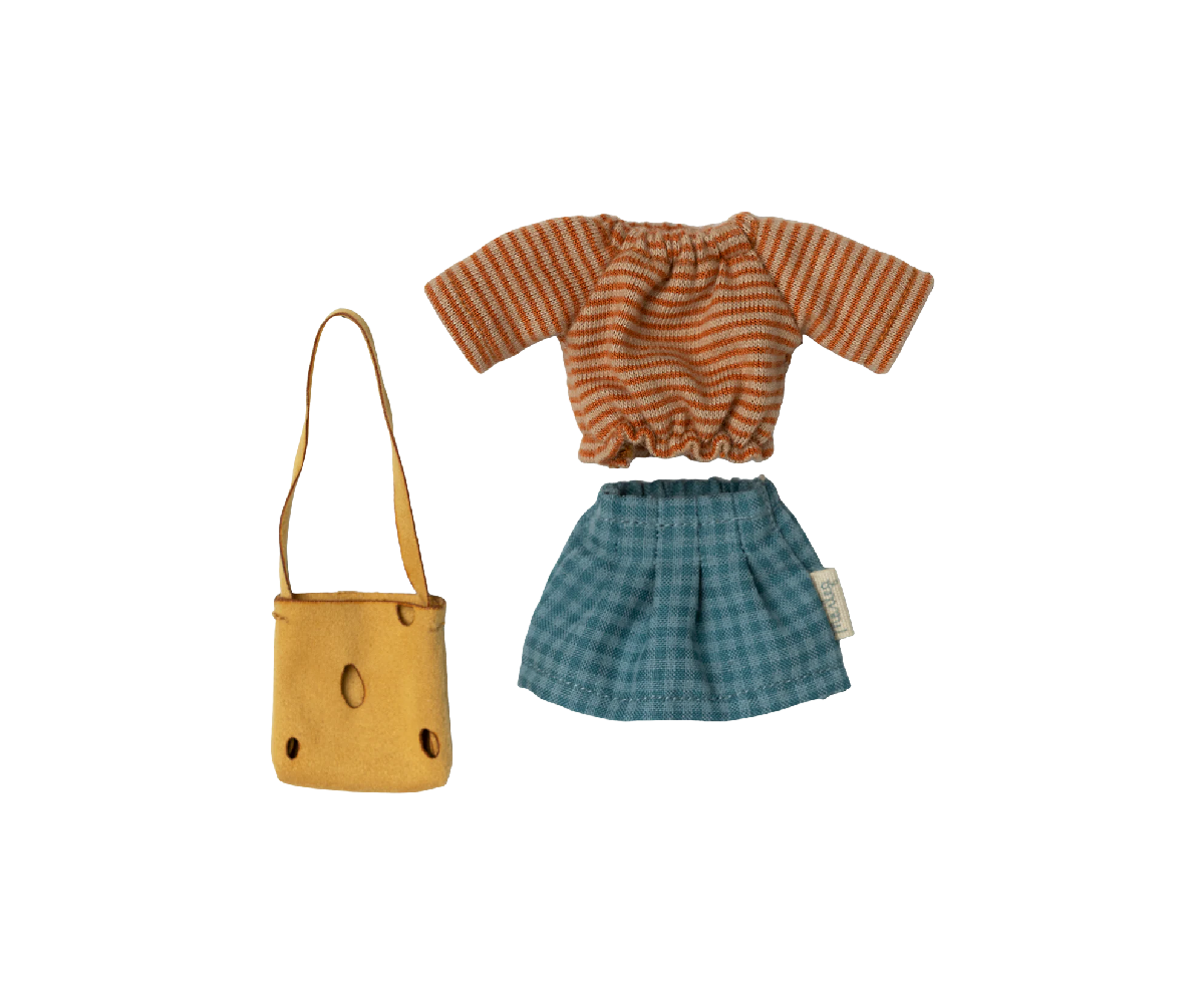 Ett löst klädset för en mus i storlek mamma/pappa. Setet innehåller en kjol, en blus och en väska med osthål.