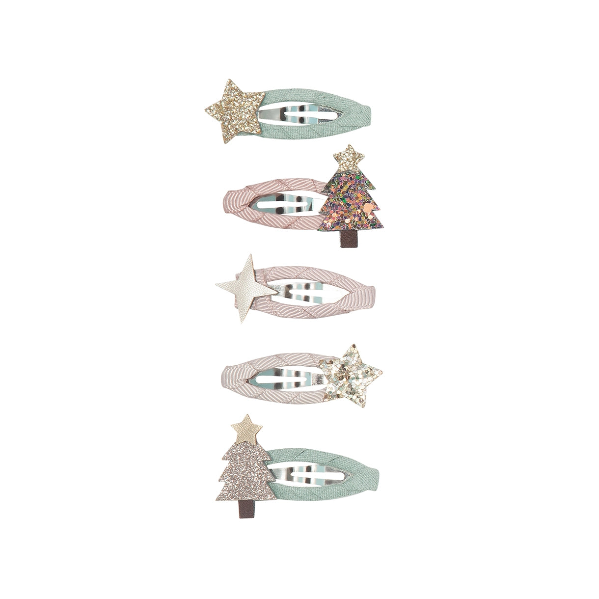 5 hårspännen från Mimi & Lula med glittriga stjärnor och julgranar.