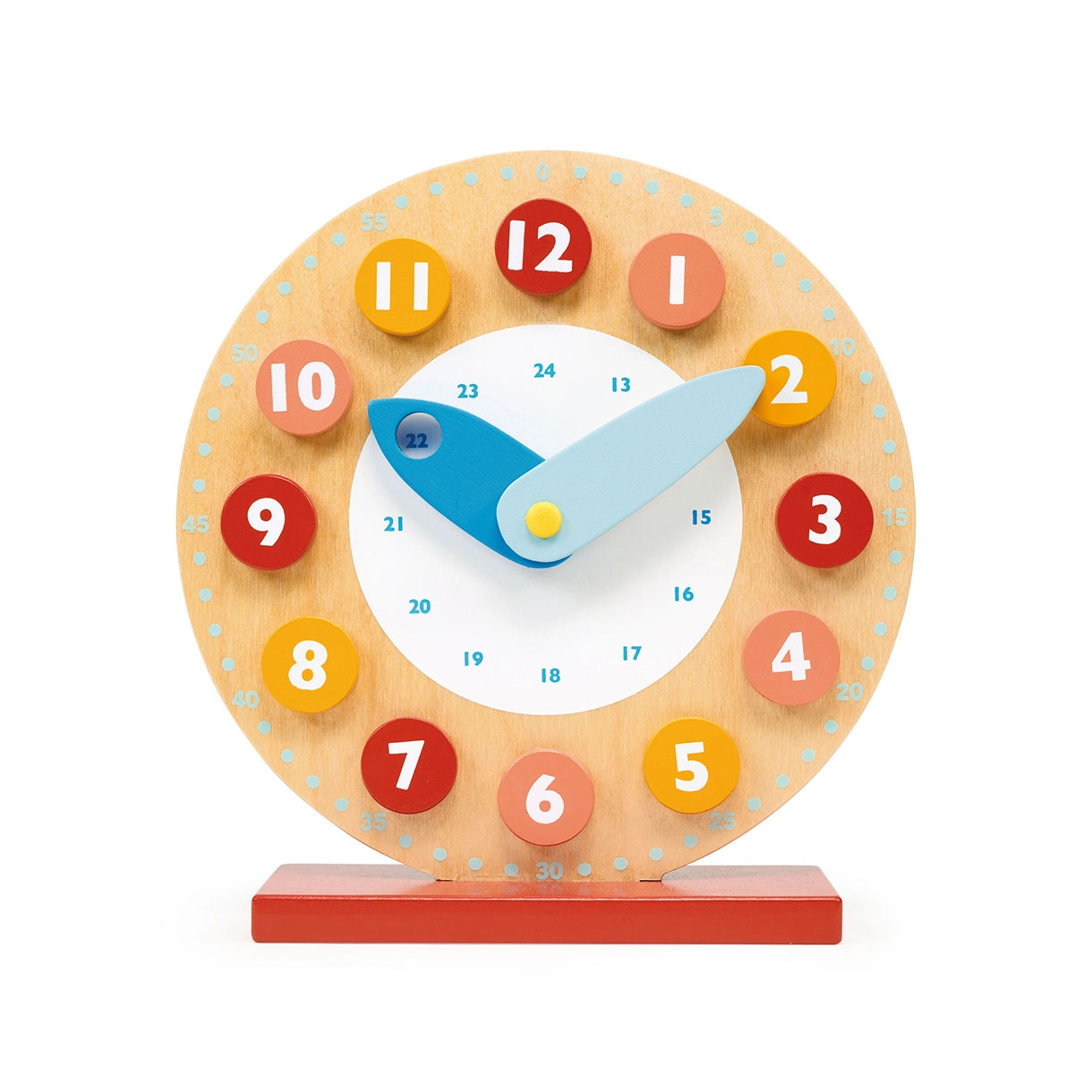 En klocka som kan användas för att lära ut tid, timmar och minuter. Har både en yttre 12-timmars urtavla och en 24-timmars urtavla tryckt på den inre cirkeln. Tim- och minutvisarna kan flyttas oberoende av varandra, så tiden kan ställas in och övas när som helst.